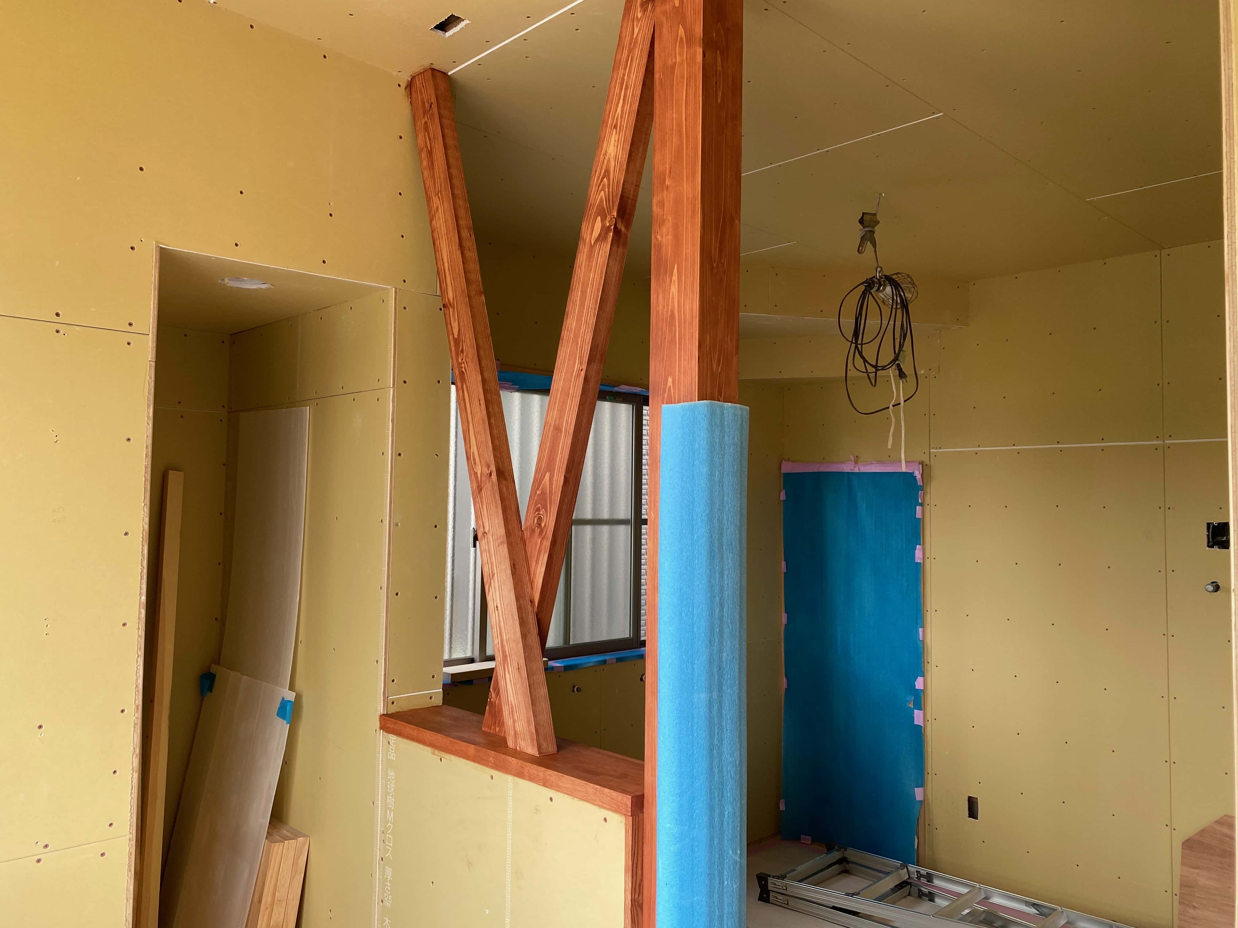 リノクラフトの戸建リノベーションではすっかり定番になった「オープン筋交い+現し柱」。築浅建物だったので耐震性能は問題なかったのですが、構造壁が多いため空間がどうしても窮屈になってしまうため、耐震性能を保ちながら開放感を作り出しています。